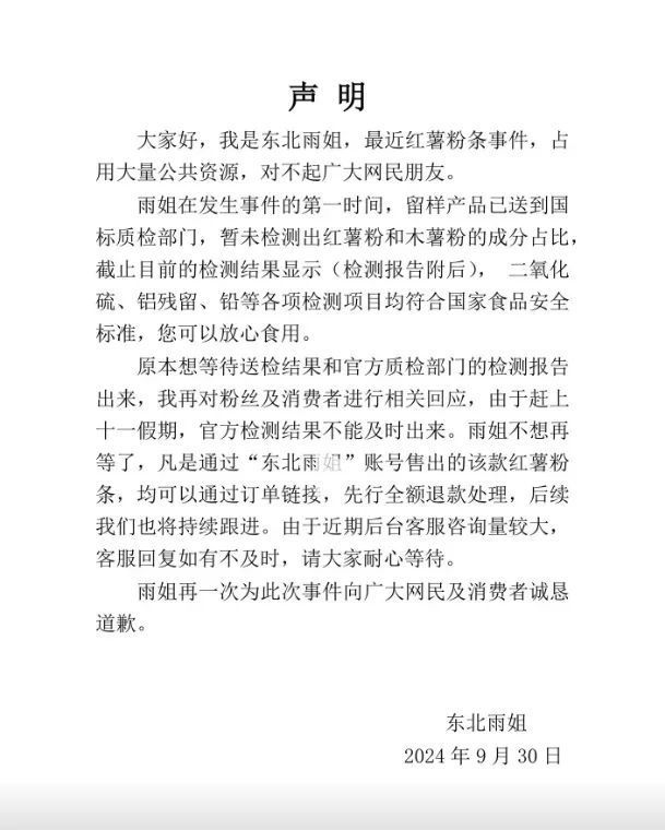 声明还提到,由于赶上十一假期,官方检测结果不能及时出来。凡是通过“东北雨姐”账号售出的该款红薯粉条,均可以通过订单链接,先行全额退款处理。